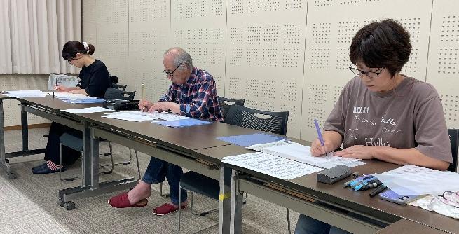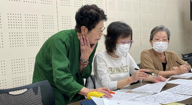 初回は基本となる部首等の練習をしたり、小澤さんに各自名前と住所のお手本を書いてもらい、トレーシングペーパーを重ねて練習しました。いろいろな雑学も教えていただきながら集中して書かれていました。
